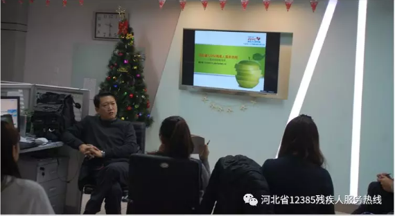 12385热线开通以来,12385工作人员在日常接线中会遇到情绪失控或者挫折后情绪低落的残疾人,12385工作人员对待这种情况还缺少专业的技巧,并且12385工作人员本身就是残疾员工,在听到残疾人诉说自己的遭遇时,工作人员容易产生不良的代入感也会有一定的心理压力,为了更好地为残疾人服务,同时也能掌握一些自我心理调适的技能,1月10日上午,河北省新东方心理公司的咨询师董利军为12385工作人员讲述了一堂心理知识课,课程主要围绕“残疾人心理热线的综述及基本方法”为中心,内容包括:心理热线的基本概念;心理热线的定位及目标;心理热线的基本程序;建立咨询关系的技巧及热线咨询需要特别注意的问题等。通过董老师讲述的沟通技巧和心理引导,使我们更快、更顺利的了解致电人的心理特征及诉求,工作效率和个人心理素质都得到了提高,也学到了如何更有效的应对情绪激动的残疾人和减少不良心理的代入感。