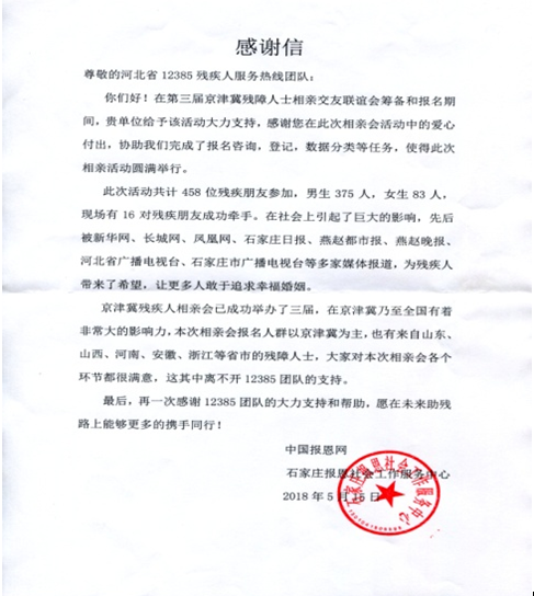 你们好!在第三届京津冀残障人士相亲交友联谊会筹备和报名期间,贵单位给予该活动大力支持,感谢您在此次相亲会活动中的爱心付出,协助我们完成了报名咨询,登记,数据分类等任务,使得此次相亲活动圆满举行。