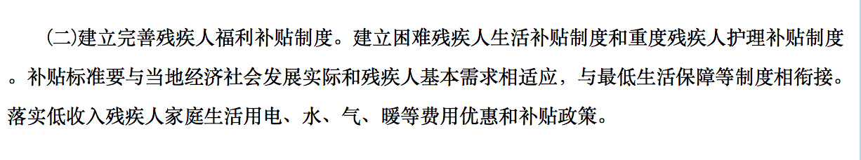 目前已经进入2020年,《国务院关于加快推进残疾人小康进程的意见》(2016-2020)中,在残疾人福利补贴制度部分,对残疾人两项补贴和电、水、气、暖补贴进行了专门介绍。