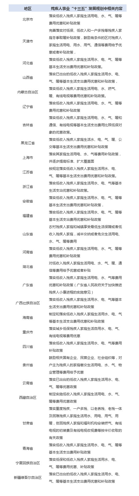 《山东省残疾人事业“十三五”规划》:“农村残疾人家庭和城镇享受最低生活保障或者低收入残疾人家庭,减半交纳或者免交生活用电、水、气、暖等费用。”