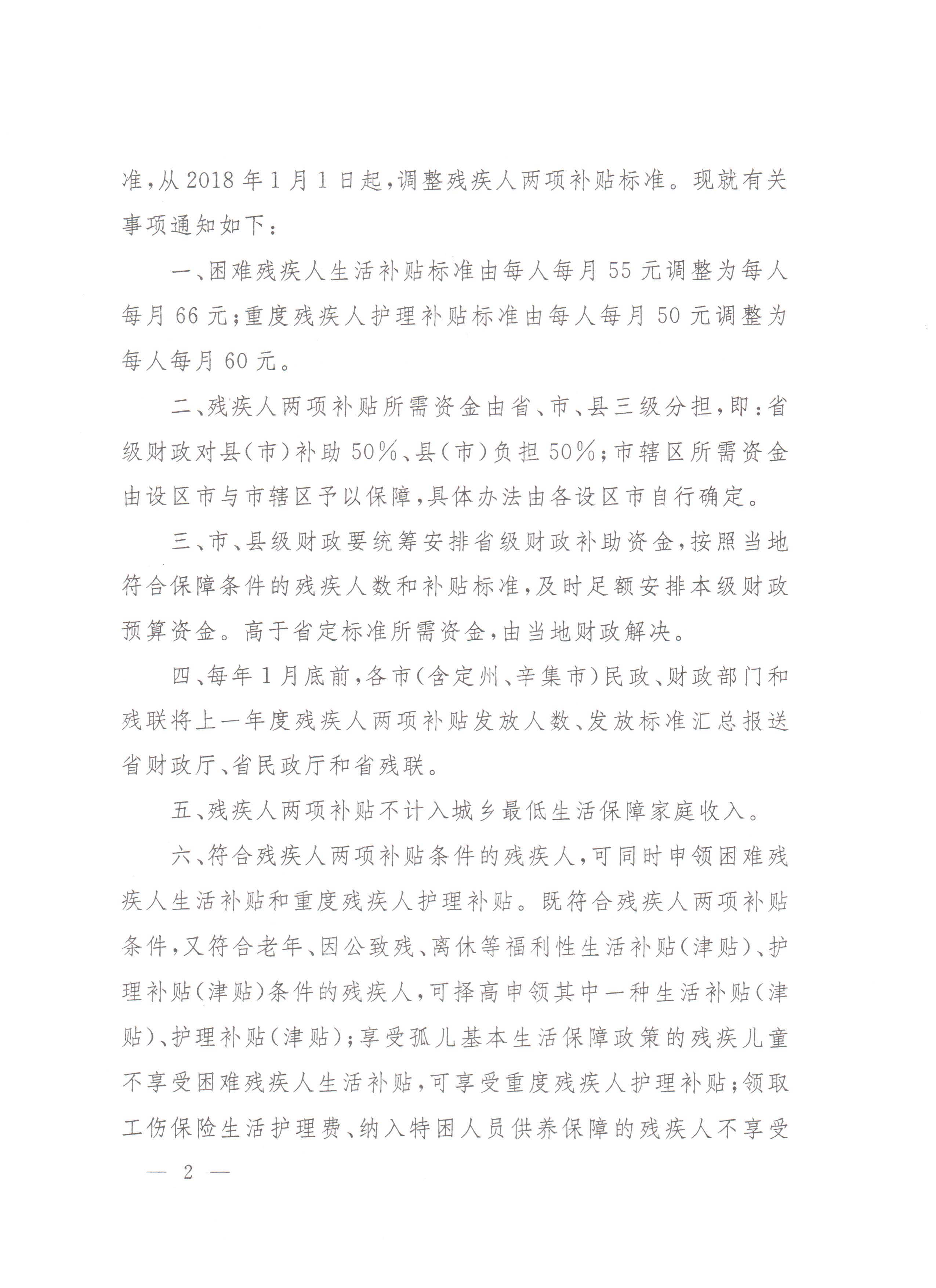 近日,省财政厅、省民政厅、省残联印发《关于调整困难残疾人生活补贴和重度残疾人护理补贴标准的通知》,为贯彻落实全国困难残疾人生活补贴和重度残疾人护理补贴制度(以下简称“残疾人两项补贴”)推进会精神,经省政府批准,从2018年1月1日起,调整残疾人两项补贴标准。